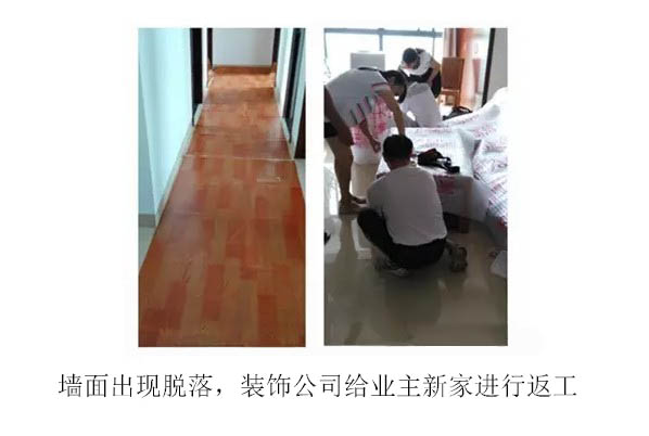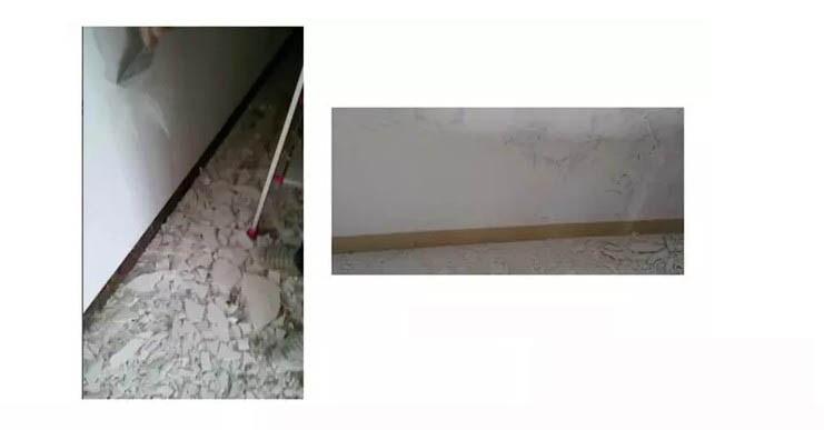 我们先来了解一下墙面脱落的情况。你看这两张图片,是某小区一年前新装修的房子,原墙面腻子未铲除,直接刮了新腻子,做了墙漆,结果入住不到一年,墙面起壳了。